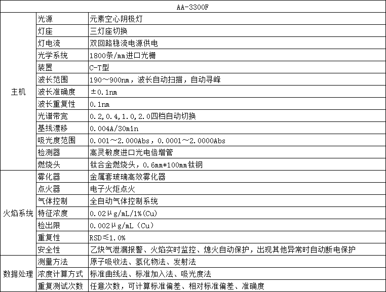 色散率為1800條/毫米刻線大面積光柵,新型自準直單色器,所有鏡片均是石英鍍膜,寬廣的檢測范圍和光學穩定性確保了分析的精度。全自動3燈座配置3個獨立燈電源,另有背景校正氘空心陰極燈1支。
